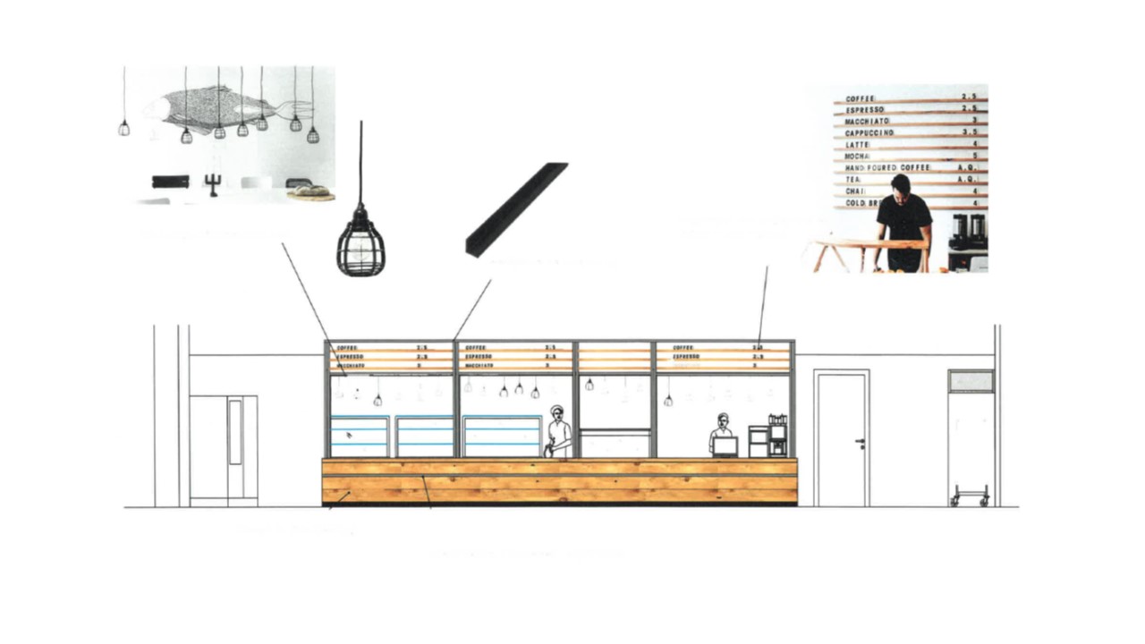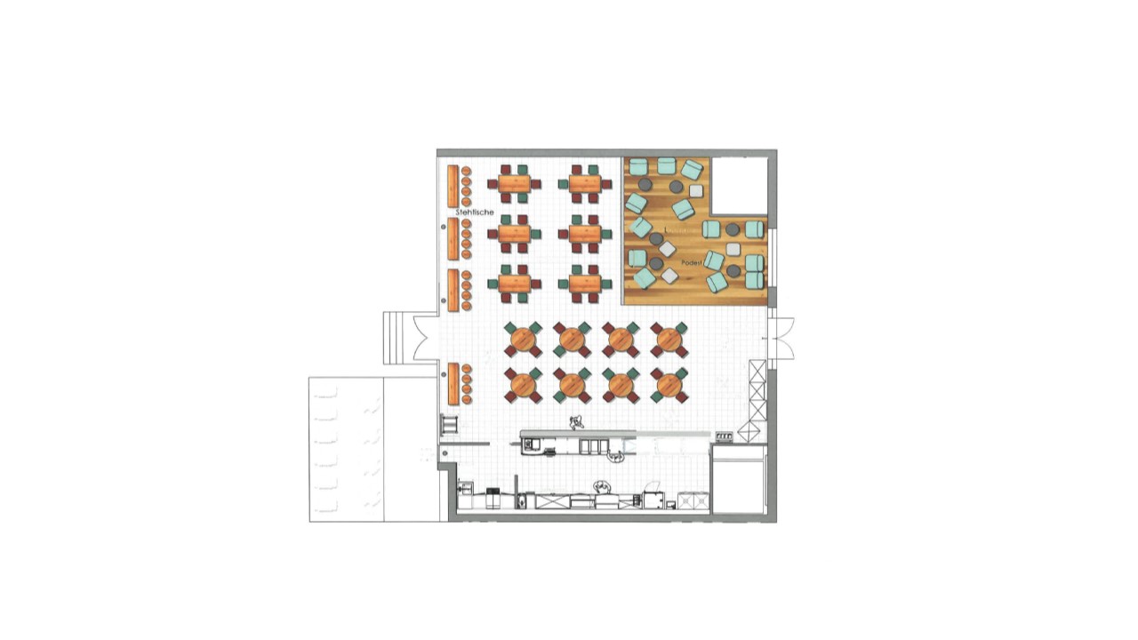 Speisenausgabe und Spülbereich, pulverbeschichteter Aufbau, Echtholzelemente, Tische